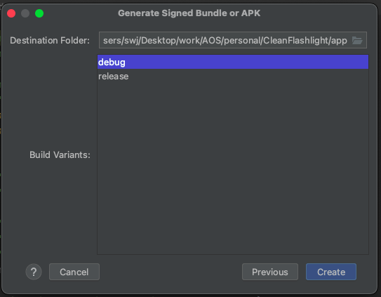 아래에서 dubug or release를 선택하고 Create 버튼을 클릭합니다.