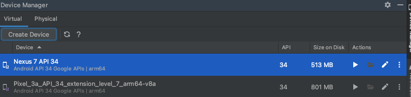 5. 'Nexus 7 API 34' 의 이름으로 가상 디바이스가 추가된 것을 확인 할 수 있습니다.