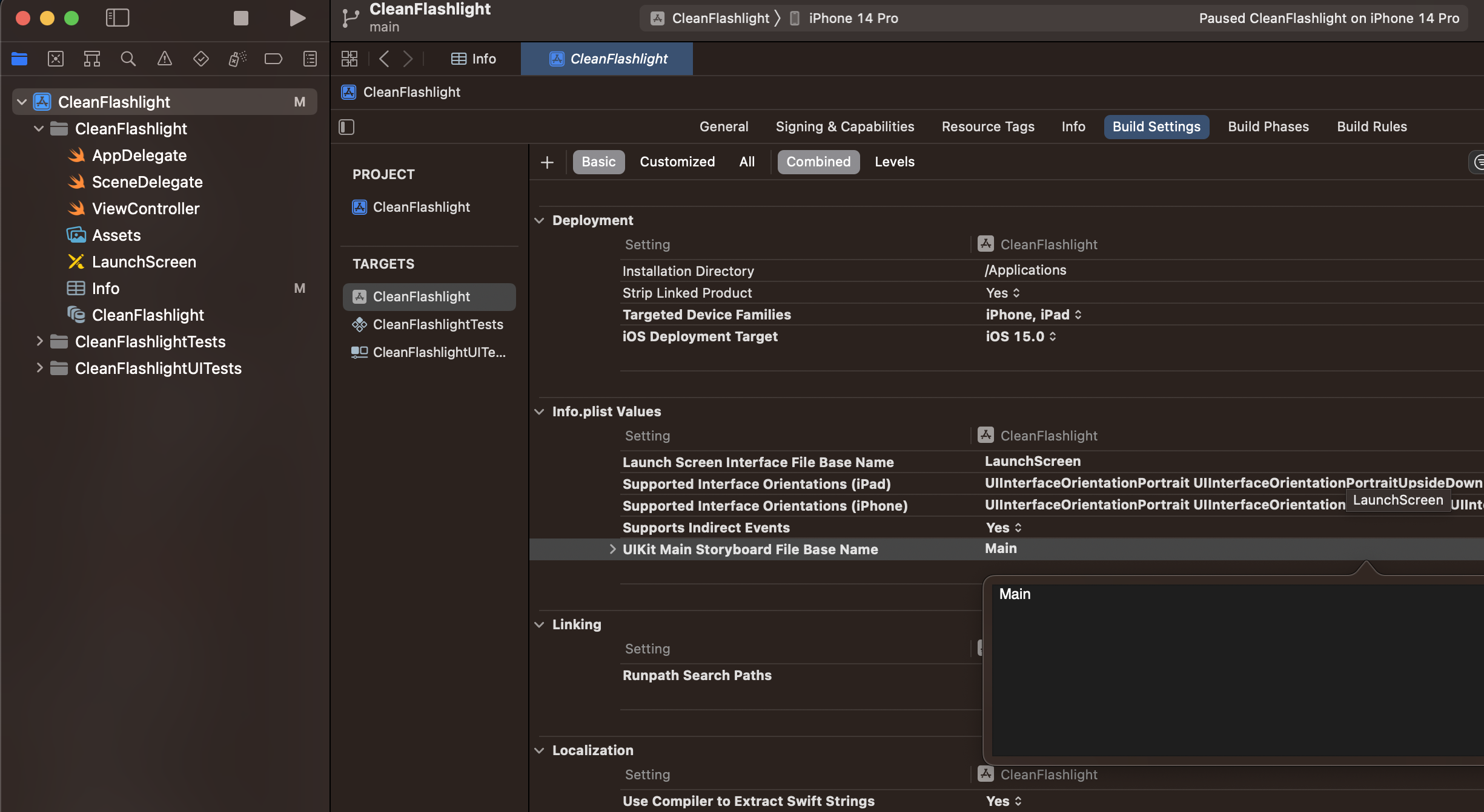 3. TARGETS -> Build Settings -> Info.plist Values -> UIKit Main StroyBoard File Base Name -> main 삭제하기